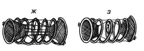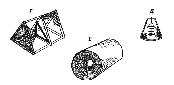 Рис. 44. Мережи: А – конусная; Б – купольная; В – полуцилиндрическая; Г – трехгранная; Д – складная; Е – деревянная;Ж – легкоукладываемая; З – улучшенная модель