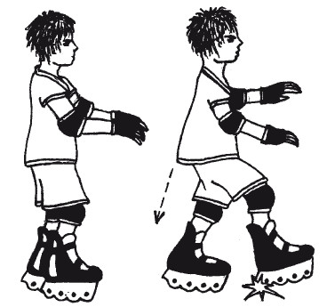 На роликовых коньках падай всегда вперед. Только таким способом ты можешь избежать слишком опасных травм – спины или копчика. Сначала упади на колени, защищенные наколенниками, а потом выстави вперед ладони. Если тебе не удалось упасть вперед, и ты чувствуешь, что падаешь назад, попытайся быстро перевернуться на 180 градусов и упасть на руки.