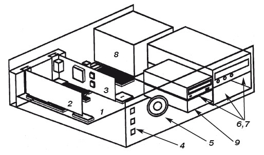 1 – системная плата (материнская плата), к которой подсоединены шины, процессор, контроллеры портов, оперативная память, контроллер клавиатуры, BIOS; 2 – видеоконтроллер; 3 – контроллер дисков и дискет;4 – органы лицевой панели; 5 – динамик; 6,7 – отсеки для дискет, дисков CD, DVD; 8 – блок питания; 9 – место для установки жесткого диска