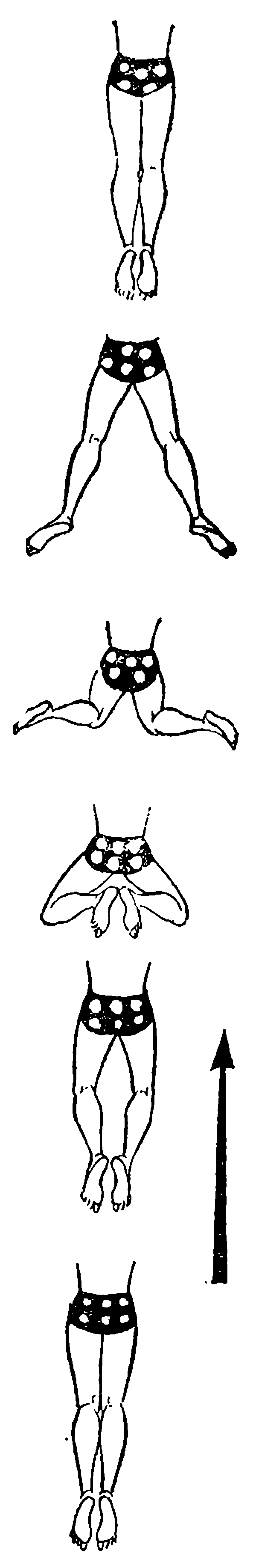 Каждый цикл движений выполняется обеими ногами одновременно и симметрично и имеет две части (рис. 22): подготовительную (пассивную, не продвигающую пловца вперед) и гребковую (активную, двигающую пловца по поверхности воды). Подготовительную часть нужно сделать как можно скорее, добиваясь, чтобы все тело (особенно стопы и бедра) по возможности постоянно находилось в горизонтальном (или близком к нему) положении.