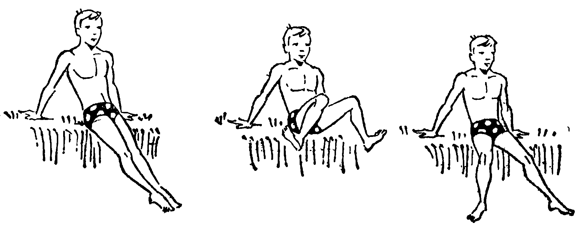 Однако прежде, чем приступить к изучению этих движений, освойте их на берегу (рис. 23), сидя на бугорке, скамейке), опираясь на вытянутые назад руки, лежа на животе (на узкой скамейке) или на спине (на бугорке). На «раз» подтяните ноги к животу, «два» выполните гребок, «три» возвратитесь в и. п. Повторите 20–25 раз.