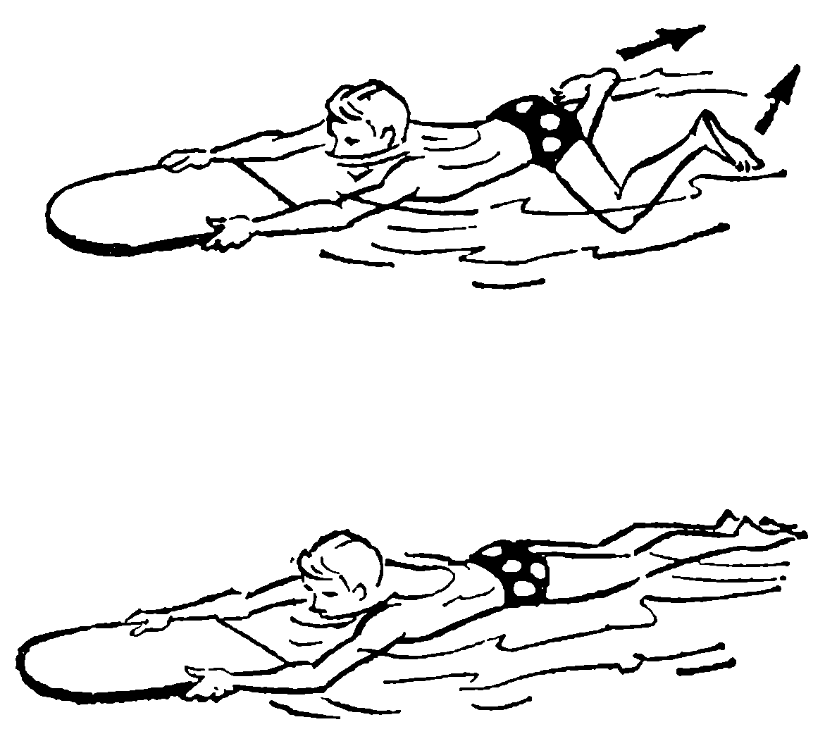 После двух-трех занятий можно посоревноваться с партнером: кто больше проскользит в воде от одного гребка ногами, держась руками за доску, кто скорее преодолеет 5 или 10 м, кто на 10-метровом отрезке сделает меньше гребков ногами.