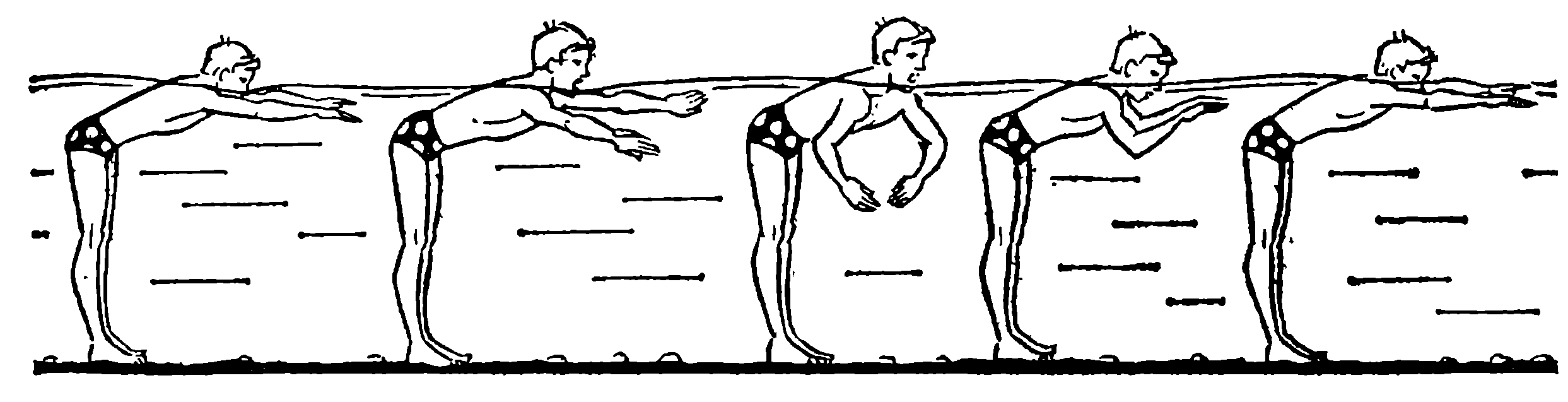 И. п. — лежа на животе, руки вытянуты вперед ладонями вниз, голова до бровей (вначале до подбородка) опущена в воду.