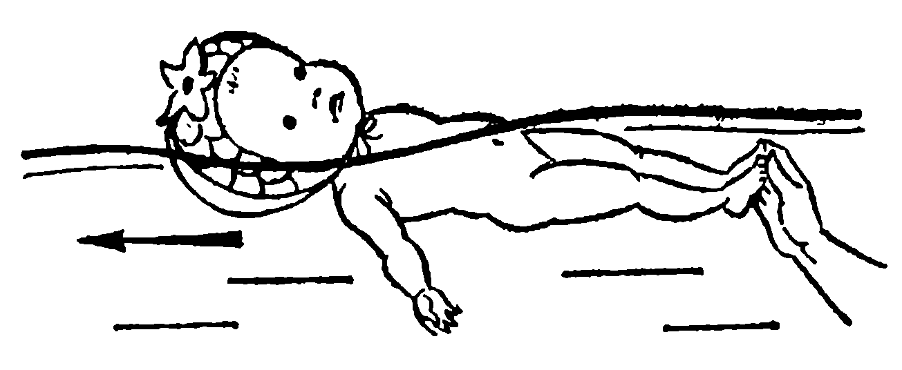 Ребенок находится в положении на спине в «чепчике русалки» или поддерживается под затылок подвеской, находящейся в руках ассистента. Обхватите стопы ребенка, затем:
