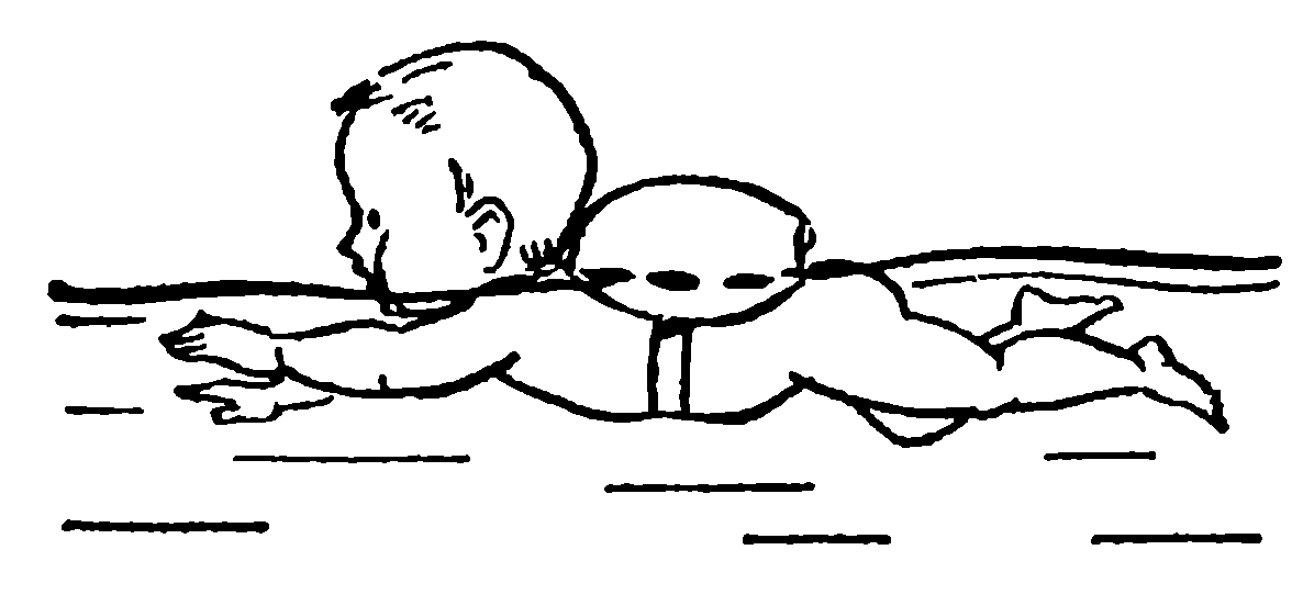 В положении на груди упражнения выполняются так же, как и на спине. Но, поскольку самостоятельно лежать на воде в положении на груди ребенок еще не способен, ему надо облегчить задачу, надев «пояс Нептуна» (рис. 34).