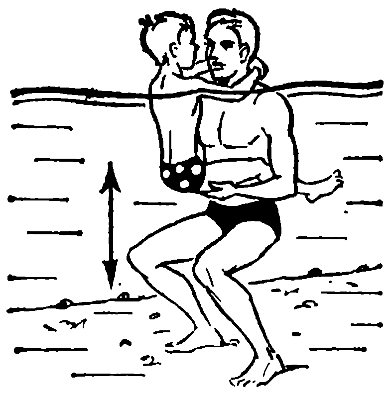 Верхом — к водичке. (рис. 1). Ребенок садится на область живота учителя, обнимает его руками за шею. Учитель поддерживает ребенка за таз, смотрит ему в глаза и, говоря: «Побежим в гости к водичке. Хорошо, интересно. Водичка ласковая, добрая», вбегает в воду. Когда вода доходит учителю до поясницы, он останавливается и 10–12 раз окунается в воду так, чтобы она достигла шеи ребенка. Потом возвращается к берегу, и на мелком месте (вода до поясницы ребенка) ставит малыша на дно и, придерживая его за руку, по команде «Кто скорее!» выбегает с ним на берег. Упражнение повторяется 3–4 раза. В конце урока это упражнение выполняется еще раз, но ребенок садится на спину учителя. В таком положении учитель может поплавать на груди вдоль берега, а затем уже поставить ребенка на дно и выбежать с ним на берег. Так ребенок научится самостоятельно выходить из воды.