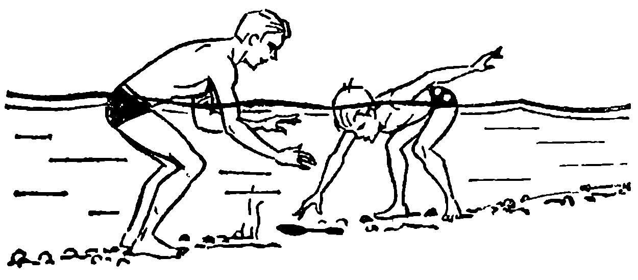 Кто скорее найдет, (рис. 2). Учитель забрасывает в воду ложку, камень или другой потопляемый предмет с таким расчетом, чтобы он упал на глубине не более чем 1 м. По команде «Кто скорее найдет?!» учитель вместе с ребенком вбегает в воду, и они начинают искать предмет. Учитель поощряет ребенка словами, но, когда он в поисках предмета окунается под воду, с особым вниманием следит за его поведением под водой. Когда предмет найден, оба выбегают на берег и вновь забрасывают его в воду. Повторите упражнение 10 раз. Чтобы заинтересовать ребенка, можно подсчитывать очки: «Один — ноль в пользу Сережи», «Два — ноль», «Два — один» и т. д. Можно для наглядности записывать счет на песке.
