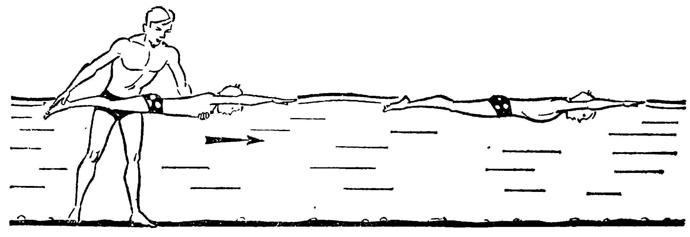 Толчок делайте по направлению к берегу: 1) и. п. — лежа на груди, руки вперед, ноги прямые, лицо в воде. Задержав дыхание, выполните скольжение. Партнер, стоя сбоку, поддерживает вас одной рукой под живот, другой с силой толкает стопы вперед. Повторите 4–5 раз; 2) и. п. — сидя по грудь в воде лицом к берегу. Сделайте два выпрыгивания из воды (упражнение 1), затем с силой оттолкнитесь ото дна, задержите дыхание на вдохе и из самого верхнего положения бросьтесь вперед на поверхность воды вытягивая вперед руки. Займите горизонтальное положение и скользите на груди до полной остановки. При этом нужно добиваться того, чтобы проскользить от места толчка минимум 2 м. Повторите 8—10 раз поочередно с партнером. Можно посоревноваться, кто проскользит большее расстояние. Этот вариант толчка выполняйте на том же занятии после повторения упражнения 4 или 5; 3) и. п. — стоя спиной к партнеру (партнер стоит по пояс в воде лицом к берегу, пальцы его рук сложены «замком» ладонями вверх). Пятку правой (левой) ноги установите на ладони партнера и руки вытяните вверх. На счет «раз», «два», «три» партнер приседает и со всей силой толкает вас вперед. Вытянитесь и, задержав дыхание на вдохе, скользите вперед до полной остановки, сделайте выдох в воду и станьте на дно. Партнер должен громко называть преодоленное в скольжении расстояние. Повторите 10–15 раз. Этот вариант толчка выполняйте при повторении данного урока.