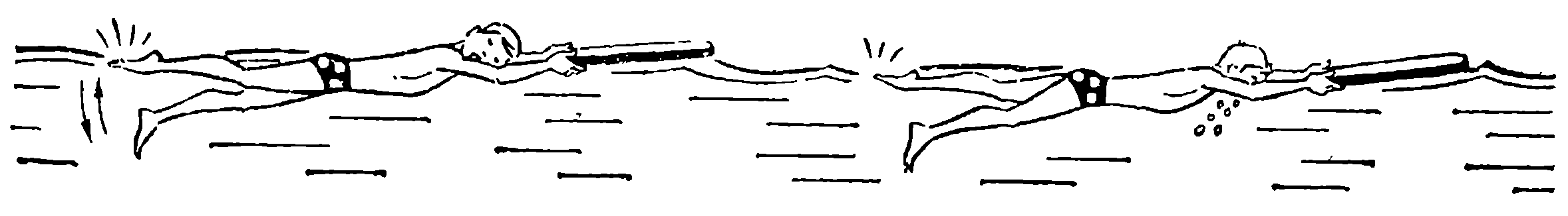 Освоив упражнение, усложните его. И. п. — то же. С силой оттолкнитесь ото дна назад, лягте на спину, задержите дыхание на вдохе, вытяните назад руки и тут же начните движения ногами, как при кроле на груди. Через 7–8 с быстро сделайте выдох, глубокий вдох и вновь задержите дыхание, продолжая работать ногами.