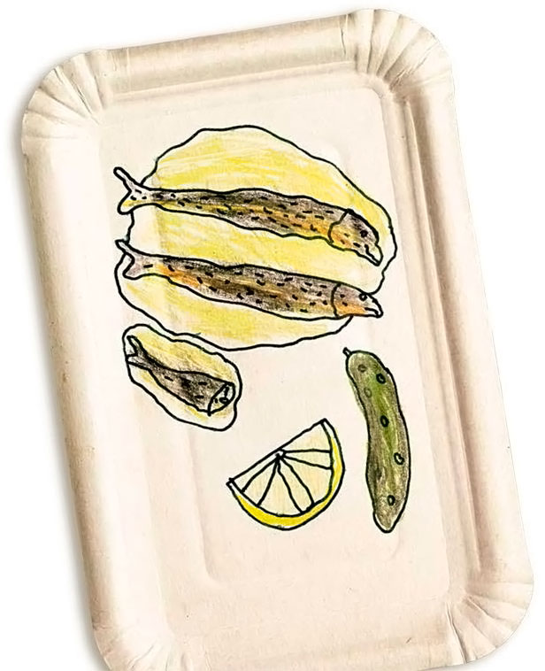 На рисунке шпроты с головой. Стало жаль их обезглавливать, так как мордочки у них получились очень выразительные.