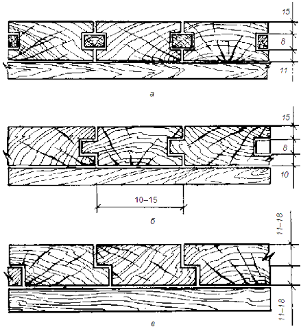 Рис. 14. Соединение досок полов: а – с помощью вставного элемента; б – в шпунт; в – в четверть (размеры даны в см)