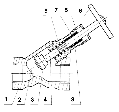 Рис. 26. Запорно-регулирующий вентиль: 1 – корпус; 2 – седло; 3 – клапан; 4 – шпиндель; 5 – накидная гайка; 6 – маховичок; 7 – втулка; 8 – сальниковая набивка; 9 – крышка корпуса