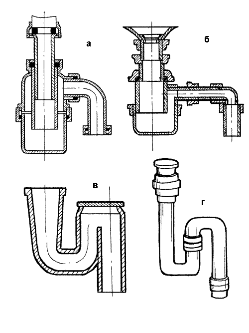 Устанавливаются сифоны под все единицы сантехнического оборудования (раковины, мойки). Существуют сифоны, различные по конструкции (бутылочные, двухоборотные, сифоны-ревизии) и по материалу (чугунные, стальные, никелированные, пластмассовые) (рис. 27).