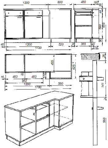 Оставлять пространство под кухонной мойкой нерабочим и пустым непрактично. Предлагаемая конструкция избавит вас от подобной проблемы. Саму мойку, то есть ее верхнюю металлическую часть, приобретите отдельно в готовом виде. Теперь сделайте для нее подстолье, его размеры рассчитаны на мойку 600 х 1400 мм. Справа будет находится большой отсек с двумя дверцами, предназначенный для ведер, чистящих средств и т. п., слева – ряд ящиков для кухонных приборов, оборудования и прочей утвари (рис. 28).