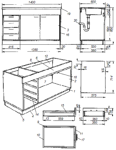 Рис. 29. Сборка подстолья для мойки: 1 – столешница; 2 – боковина; 3 – дверка; 4 – продольный брусок цоколя; 5 – поперечный брусок цоколя; 6 – передняя поперечина; 7—упорная рейка двери; 8 – задняя поперечина; 9 – стенка ящика боковая; 10 – стенка задняя; 11 – стенка ящика передняя; 12 – задняя стенка шкафа; 13 – дно ящика; 14 – направляющая; 15 – u-образная профильная направляющая; 16 – рояльная петля; 17 – ручка; 18 – защелка магнитная; 19 – моечный блок со стоками и двумя раковинами; 20 – пластиковые трубы и отводы (размеры даны в мм)