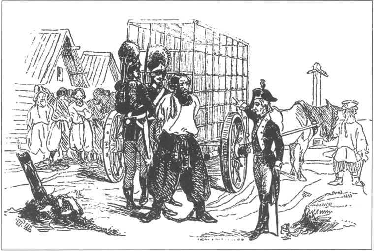 А.В. Суворов отдает распоряжение посадить в клетку Емельяна Пугачева. Гравюра XIX века с рисунка Т.Г. Шевченко
