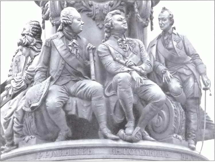 Изображение П. А. Румянцева, Г.А. Потемкина, А.В. Суворова на памятнике Екатерине II в Санкт-Петербурге. Скульптор М.О. Микешин. 1873 г.