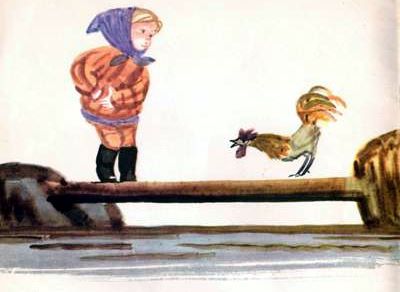Он встал на середине мосточка, посмотрел на девочку одним глазом и погрозил на своем петушином языке: