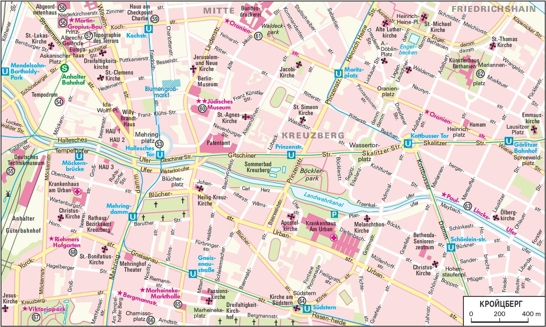От Зюдштерн отходит улица *Бергманнштрассе (Bergmannstrasse), по которой, между улицами Шлайермахерштрассе (Schleiermacherstrasse) и Мерингдамм (Mehringdamm), так и хочется прогуляться среди восточных лавок, оригинальных магазинов и множества пивных. «Торговым центром» квартала с его сочным местным колоритом является *пассаж Мархайнеке (Marheineke-Markthalle) (65) на улице Бергманнштрассе (Bergmannstrasse), один из трех сохранившихся крытых рынков. Первоначально в XIX веке были построены 14 крытых павильонов с тем, чтобы улучшить санитарные условия на воскресных рынках.