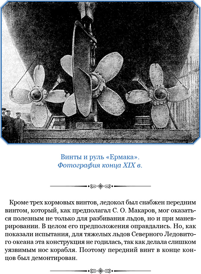 У ахтерштевня есть небольшая особенность, введенная по моей инициативе, а именно: передняя сторона ахтерштевня не представляет плоскости, нормальной к линии судна, а срезана на 45°. Выше оси винта срез идет в одну сторону, а ниже – в другую, и в таком направлении, что струя воды и лед, отбрасываемые лопастями винта, попадают на острый угол ахтерштевня. Задняя кромка переднего ахтерштевня срезана параллельно передней кромке заднего. Эта особенность уменьшает до некоторой степени сопротивление заднего ахтерштевня, а потому дает полезные результаты, хотя прямым опытом трудно установить размер пользы.