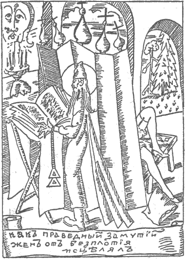 Инок Замутий, дотоле вида иссохшего – как и подобает праведнику, вдруг начал день ото дня все приметнее пухнуть. Иноки и старцы фигийские собирались на площади перед его кельей и непрестанно служили молебны о здравии Замутия, полагая, что он заболел тяжкой щеголевой болезнью. Жены, исцеленные Замутием от неплодия, рыданием заглушали молитвенное пение.