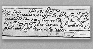 Акт о рождении и крещении Н. Паганини. Из книги записей церкви Санта-Кроче и Сан-Сальваторе в Генуе.
