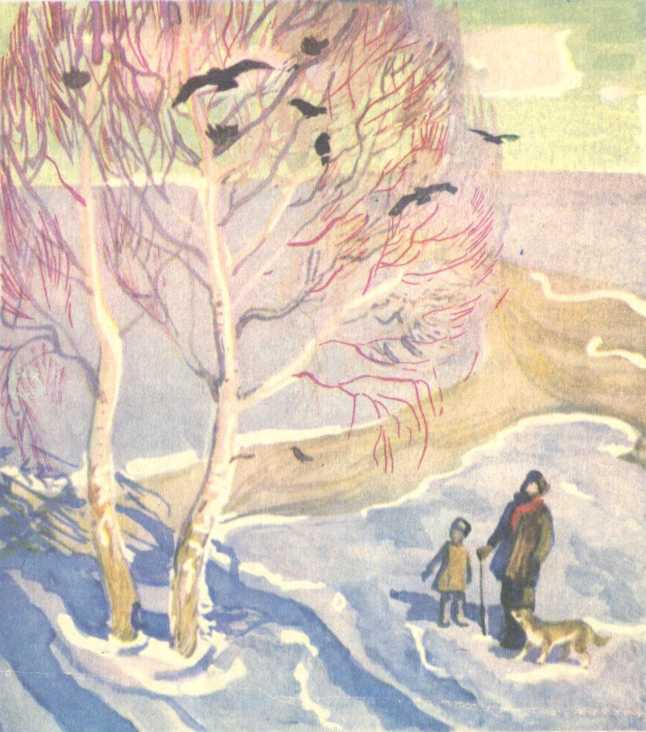 Утром сквозь частый березняк желто светило на снег туманное солнце, и в колеях дороги, в каждой впадинке, за каждым комком лежали синие тени. Все это мальчик увидел через оттаявшее окно избы. Зимой стекла были сплошь покрыты лапастыми морозными узорами, и за ними ничего не было видно, а в это лучезарное утро вдруг открылась вся холмистая снежная даль, широкая деревенская улица, прямые медленные дымы над крышами, молодой тополек, золотившийся каждой своей почкой, и большой блестяще-черный, с седым носом грач, долбивший на дороге навозные комки.
