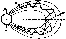 Рис. 18. Схематическое изображение траектории заряженной частицы в магнитном поле Земли
