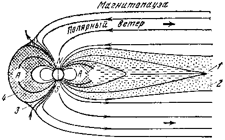 Стрелками с точкой около силовых линий показано направление движения солнечных электронов