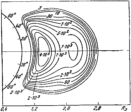 Распределение энергичных протонов с энергией больше 50 мэВ показано на рис. 22. Эти протоны образуются следующим образом. Космические лучи, которые вторгаются в атмосферу и сталкиваются с ядрами атомов кислорода и азота, порождают нейтроны двумя путями. Во-первых, это расщепление ядра, в результате чего возникают выбитые нейтроны с энергией порядка 1 МэВ — 1 ГэВ. Во-вторых, это возбуждение ядер, при этом нейтроны «испаряются» по мере перехода ядра к нормальному состоянию (энергия нейтрона более 8 МэВ). Эти нейтроны могут покинуть атмосферу: их движение не ограничено магнитным полем Земли. Те нейтроны, которые возникли в результате «испарения», имеют тенденцию диффундировать через атмосферу, часть из них может свободно пройти через атмосферные слои. Но нейтроны живут около 1000 с. Затем они распадаются па протон и электрон. Таким путем возникают протоны во внутреннем радиационном поясе. Непрерывный поток космических лучей способствует постоянному образованию частиц в радиационных поясах, появившихся за счет распада нейтронов.