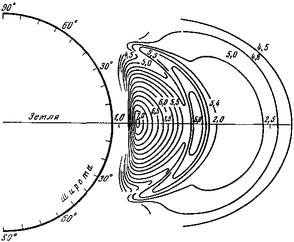Рис. 23. Распределение электронов с энергией, большей 5 мэВ, наблюдавшееся 10 ноября 1962 г.