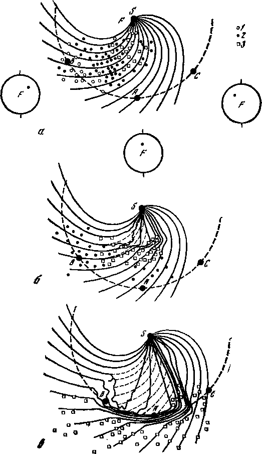 Проследим далее движение облака солнечной плазмы по направлению к Земле. Рассмотрим три момента в этом движении: через 10—30 мин, 12 ч и 40—50 ч после солнечной вспышки. Ситуация схематически изображена на рис. 24.