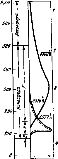 Высоты полярных сияний в низких широтах измерялись редко. Имеющиеся немногие данные говорят о том, что там эти величины выше, чем в овале полярных сияний. Они могут достигать 1000 км (см. рис. 27).