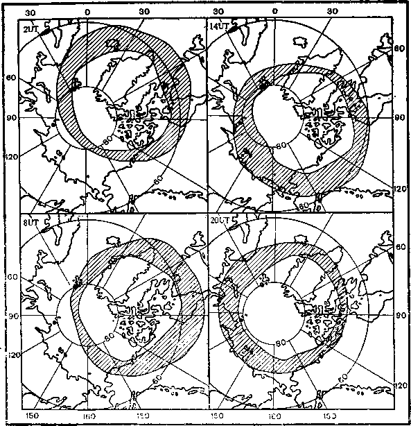 Мы показали, что в различные часы мирового времени положение овала полярных сияний меняется. Но это происходит и в результате возмущения магнитного поля Земли, т. е. при различных магнитных условиях.