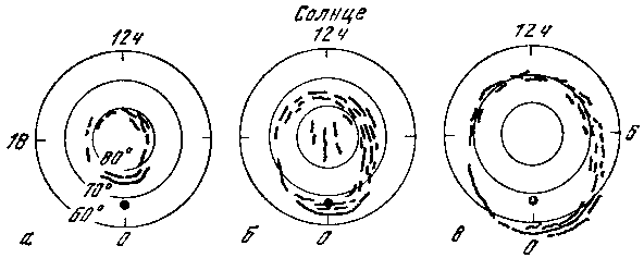 Таким образом, получается, что наблюдатель, находящийся в зоне полярных сияний, чаще всего (т. е. статистически наиболее вероятно) будет видеть спокойные дуги сияний вечером, активные лучистые полосы около полуночи и светящиеся пятна в утренние часы. Может даже создаться впечатление о некотором фиксированном распределении активности полярных сияний, под которым Земля прокручивается в течение суток.