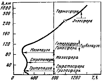 Рис. 36. Высотный профиль температуры земной атмосферы