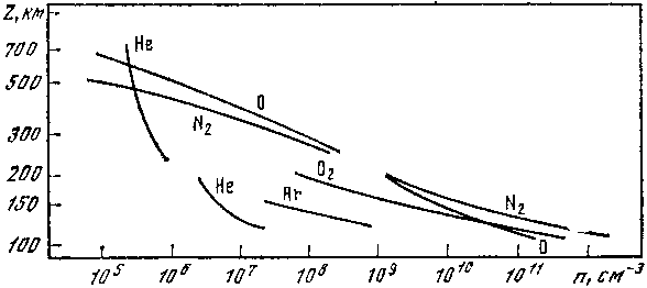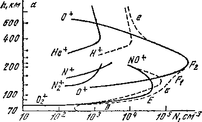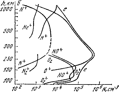 Скорость образования электронов в зависимости от высоты дана на рис. 41. Здесь, в частности, показано, что суммарная скорость ионообразования (5) ответственна за образование ионосферы. Высотные профили концентрации различных ионов (N2+, O2+, NO+, O+, N+, He+, H+) и электронов е показаны на рис. 42.