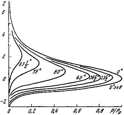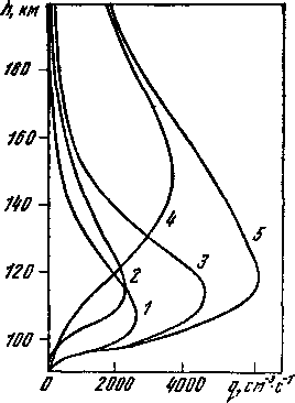 На рис. 40 показаны высотные профили скорости новообразования (количество свободных электронов, образованных за 1 с в 1 см3) для различных величин зенитного угла Солнца. Высота Z выражается через истинную высоту h и высоту однородной атмосферы Н