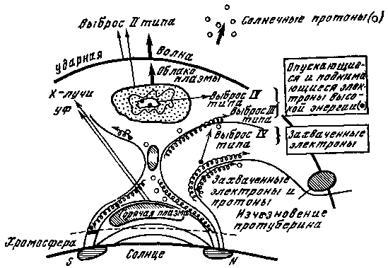 Рис. 3. Схема основных процессов, которые происходят во время типичной солнечной бури