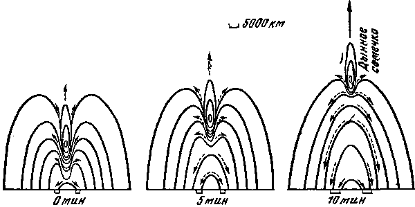 Для проблемы солнечно-земных связей важен вопрос о выбросе солнечной плазмы. Однако рассматривать его подробно мы не можем. Приведем только схематически возможный механизм такого выброса (рис. 4). Как видим, происходит выталкивание диамагнитной солнечной плазмы из неоднородного магнитного поля. При этом часть выброшенного вещества вызывает уярчение, которое подобно вспышке. В этом механизме до высот 2000—3000 км плазма быстро ускоряется, затем после продолжительного движения с постоянной скоростью она быстро замедляется под действием гравитации.