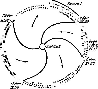 Вектор межпланетного магнитного поля имеет радиальную составляющую Вr, направленную или от Солнца (знак +), или к Солнцу (знак —). Межпланетное пространство разделено на чередующиеся спиральные секторы, в каждом из которых радиальная компонента направлена либо наружу, либо вовнутрь. На рис. 6 показана межпланетная секторная структура, наблюдаемая на расстоянии с Земли в течение двух с половиной периодов вращения Солнца с 1 декабря 1964 г.
