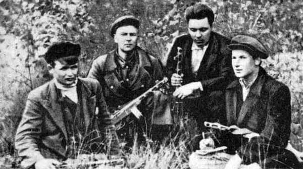 Члены бюро комсомольской организации дивизии (слева направо): В. А. Олейник, А. В. Федоров, С. Д. Бокарев, М. В. Андросов — помощник командира по комсомолу