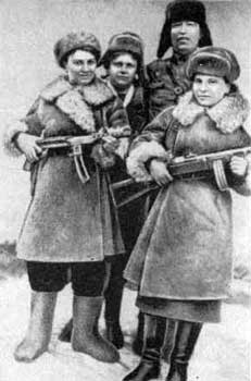 Слева направо: радистка Клава Лычана (Михайликова), медсестра Шура Галушка, командир полка П. Л. Кульбака, радистка Рая Шарова