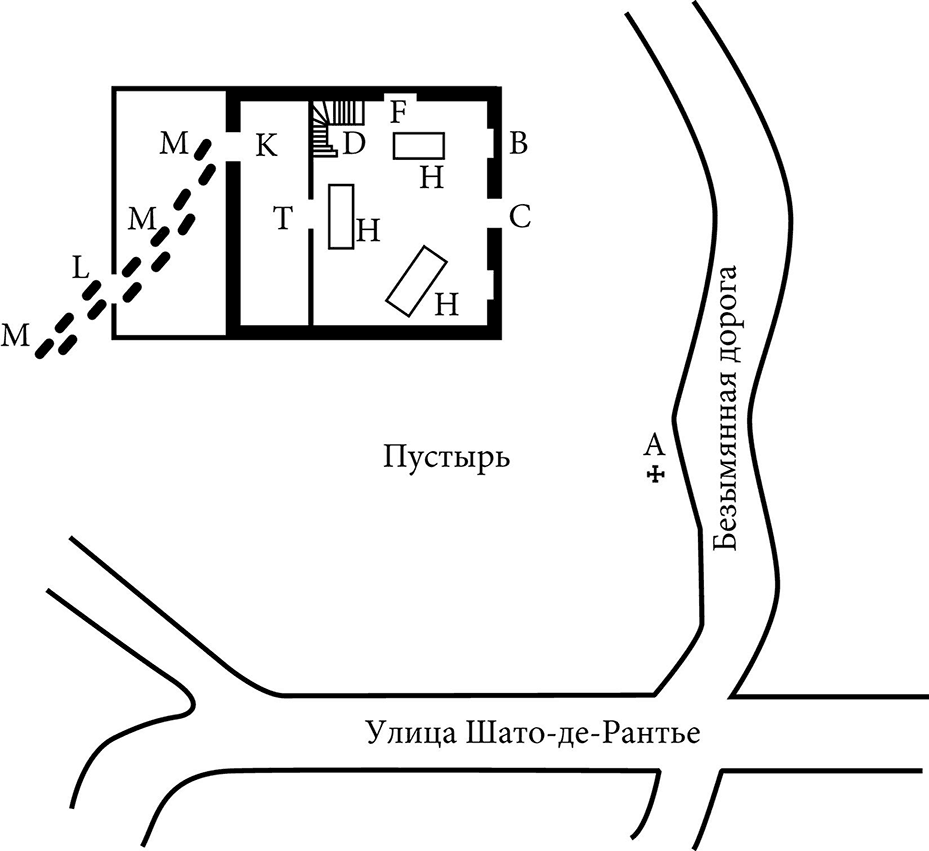 А – Место, где патруль под командованием инспектора Сыскной полиции Жевроля услышал крики жертв. (Расстояние от этого места до кабаре под названием «Ясный перец» составляет всего сто двадцать три метра. Это позволяет предположить, что услышанные крики были первыми и что, следовательно, потасовка только началась.)