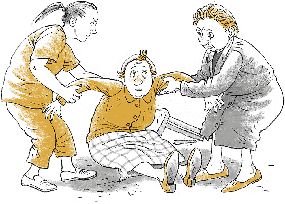 К бабушке Жене подлетели и медсестра, и нянечка и давай её в разные стороны тянуть, чтобы поднять. Нянечка – вправо, медсестра – влево! Вправо! Влево! Вправо! Влево!