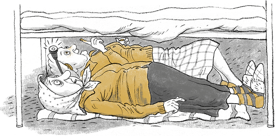 Бабушка Женя лежала на полу. На лбу у неё горел фонарик и освещал дно кровати. А сама бабушка Женя водила по дну пальцами. Бабушка Лида кое-как подпихнула под бабушку Женю одеяло, сама улеглась рядом. И тут же ойкнула!