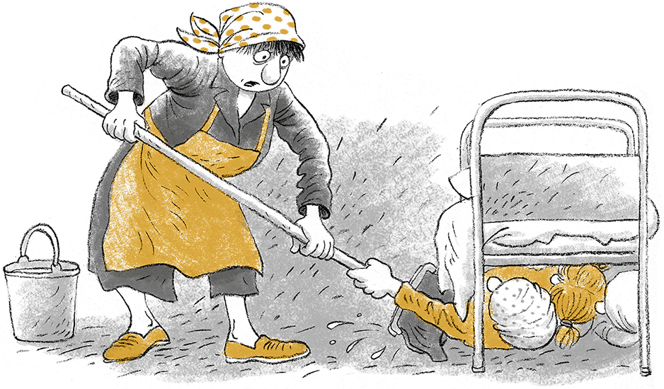 Так они рисовали и рисовали, пока не услышали сначала шаги, потом стук. Бух! А потом такой звук: «Бряк!» Это пришла санитарка! Посмотрела – нет никого в комнате! И решила вымыть пол. Бабушки и Тина переглянулись. Замерли. И только хотели вылезти, как санитарка сунула свою швабру прямо под кровать! Прямо под бок бабушке Лиде. Та как закричит! За швабру схватилась! И потянула на себя.