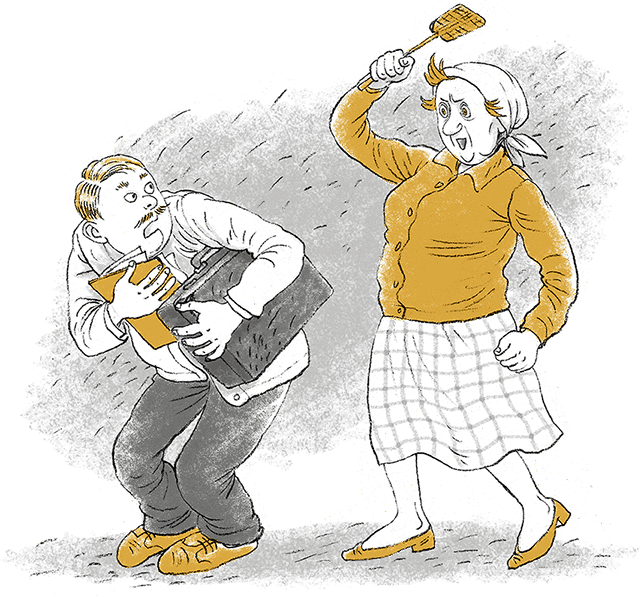 И она замахнулась мухобойкой. Молодой человек еле успел отскочить. Мухобойка шлёпнула по стулу: плюмс!