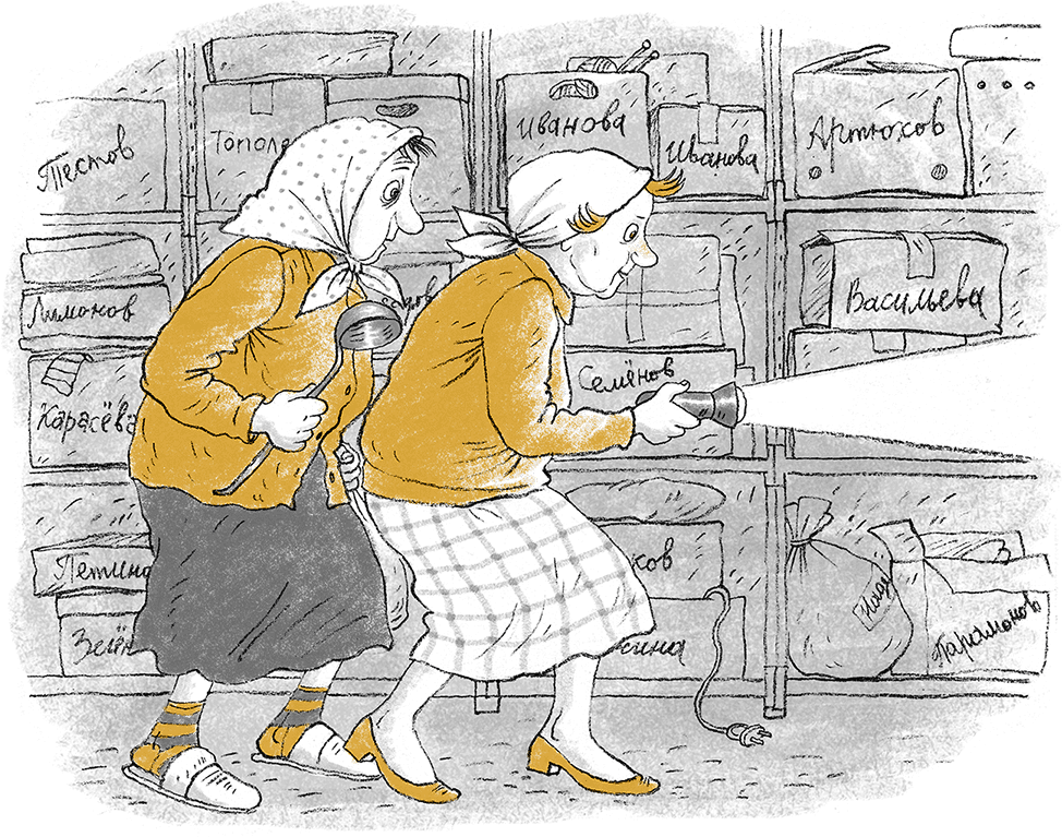 Они прислушались. Вроде бы всё было тихо. За дверью оказалась ещё одна лестница. Бабушка Женя подняла фонарик и осторожно двинулась по ней вниз. Бабушка Лида пыхтела сзади. Бабушка Женя спустилась до самого конца и осветила фонариком просторную комнату с одним-единственным маленьким окошком. Вдоль стен стояли стеллажи. Полки на стеллажах были заставлены коробками и пакетами.