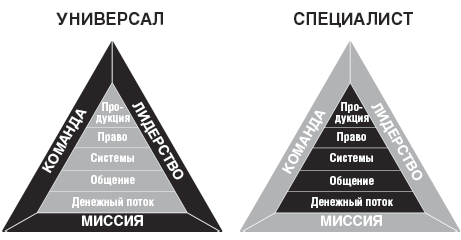 На треугольнике Б-И показаны восемь составляющих бизнеса, которые находятся в неразрывном единстве друг с другом. Настоящие предприниматели, наследники Мидаса, должны быть универсалами, то есть работать на периметре треугольника. Во внутренней же его части должны работать специалисты, которых они нанимают.